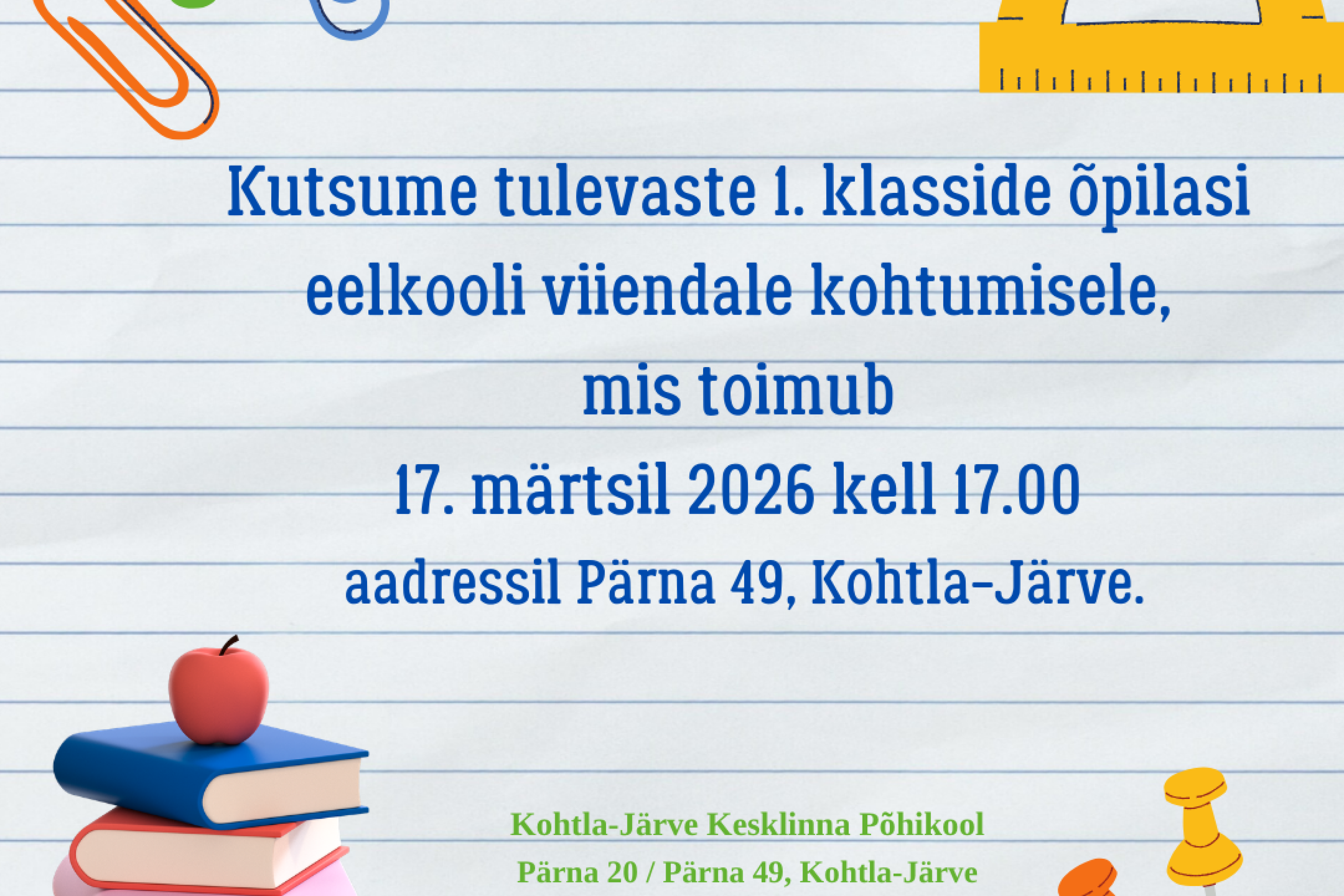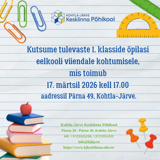 Kutsume tulevaste 1. klasside õpilasi eelkooli viiendale kohtumisele, mis toimub17. märtsil 2026 kell 17.00 aadressil Pärna 49, Kohtla-Järve.