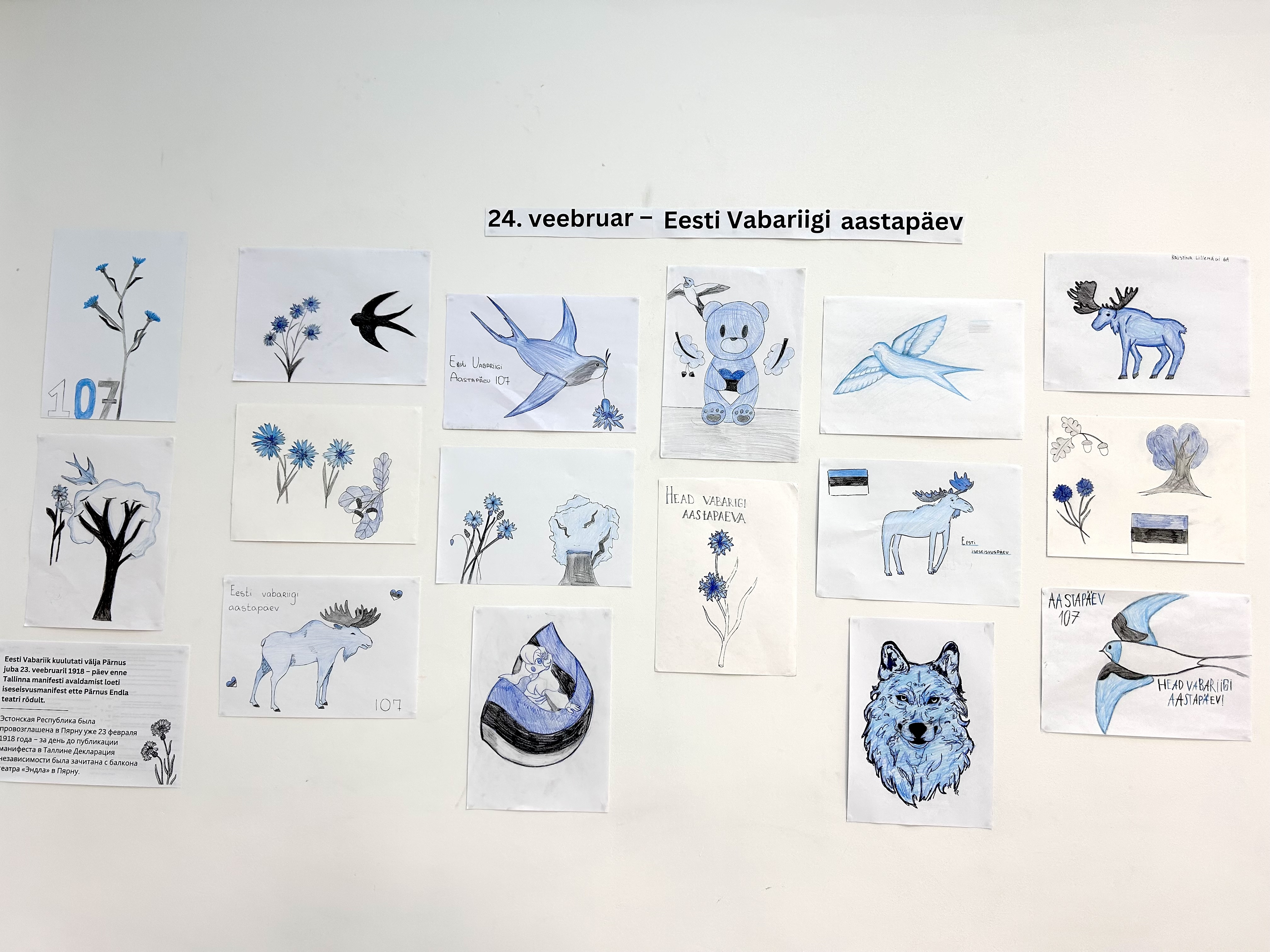 Meie kool on saanud piduliku ilme Eesti Vabariigi iseseisvuspäeva auks! Klassid ja koridorid on kaunistatud sinimustvalgetes toonides, et luua eriline ja pidulik õhkkond.