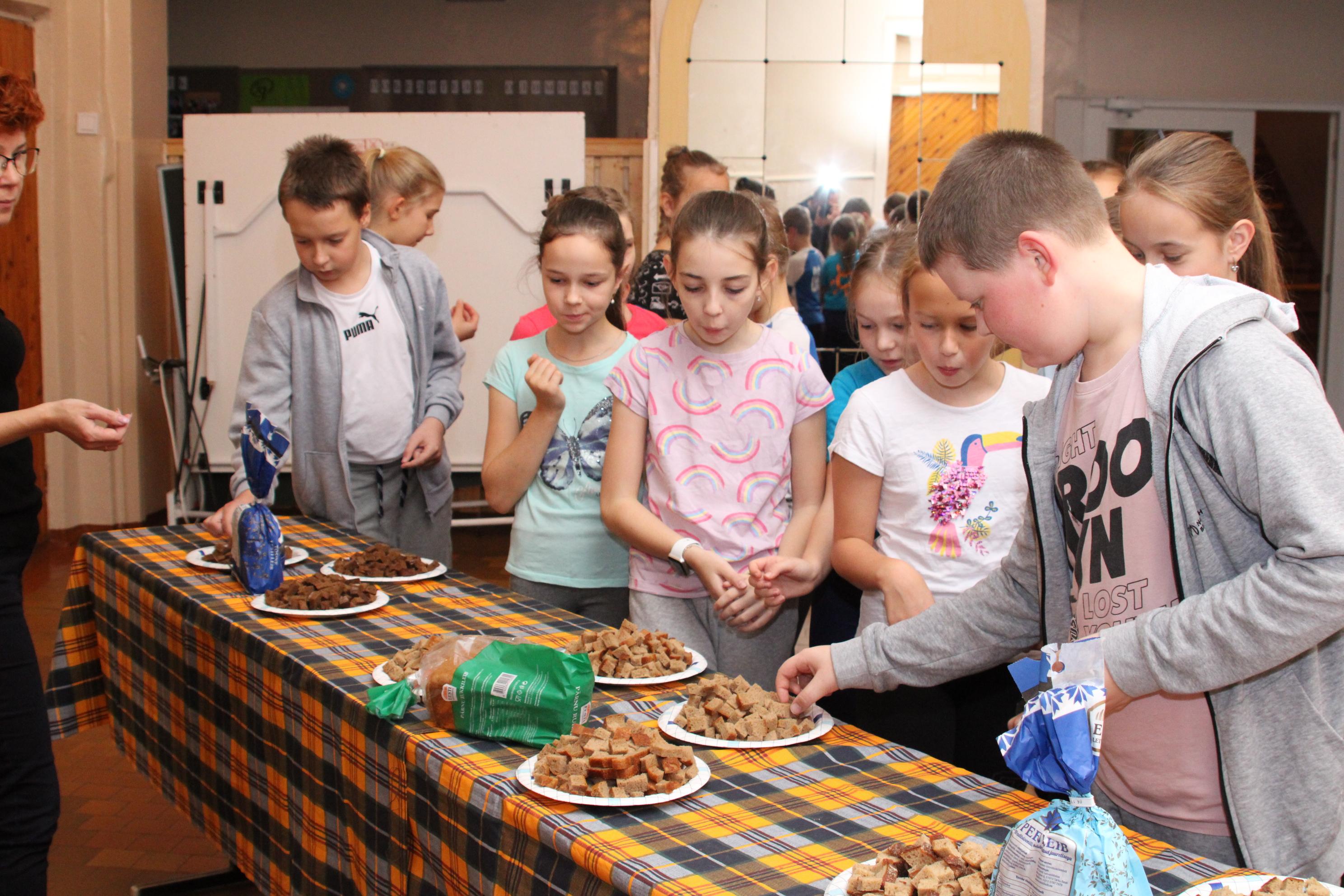 Главными и яркими участниками Недели Хлеба стала фирма Nata katab OÜ Натальи и Андрея Доможиловых, которые любезно предоставили нам свою продукцию и на открытие надели испекли каравай и вкусный шоколадный крендель. В течение всей недели они организовывали выпечку хлеба – домашнего, ароматного, с хрустящей корочкой! Ах, какой же аромат стоял в фойе! Дети были счастливы! Также участниками недели были такие фирмы как Eesti Leivatööstus, Leibur и Mantinga. Последняя фирма покорила учеников своим свежевыпеченным хлебом чиабатта с нежнейшим мякишем и превосходной корочкой.