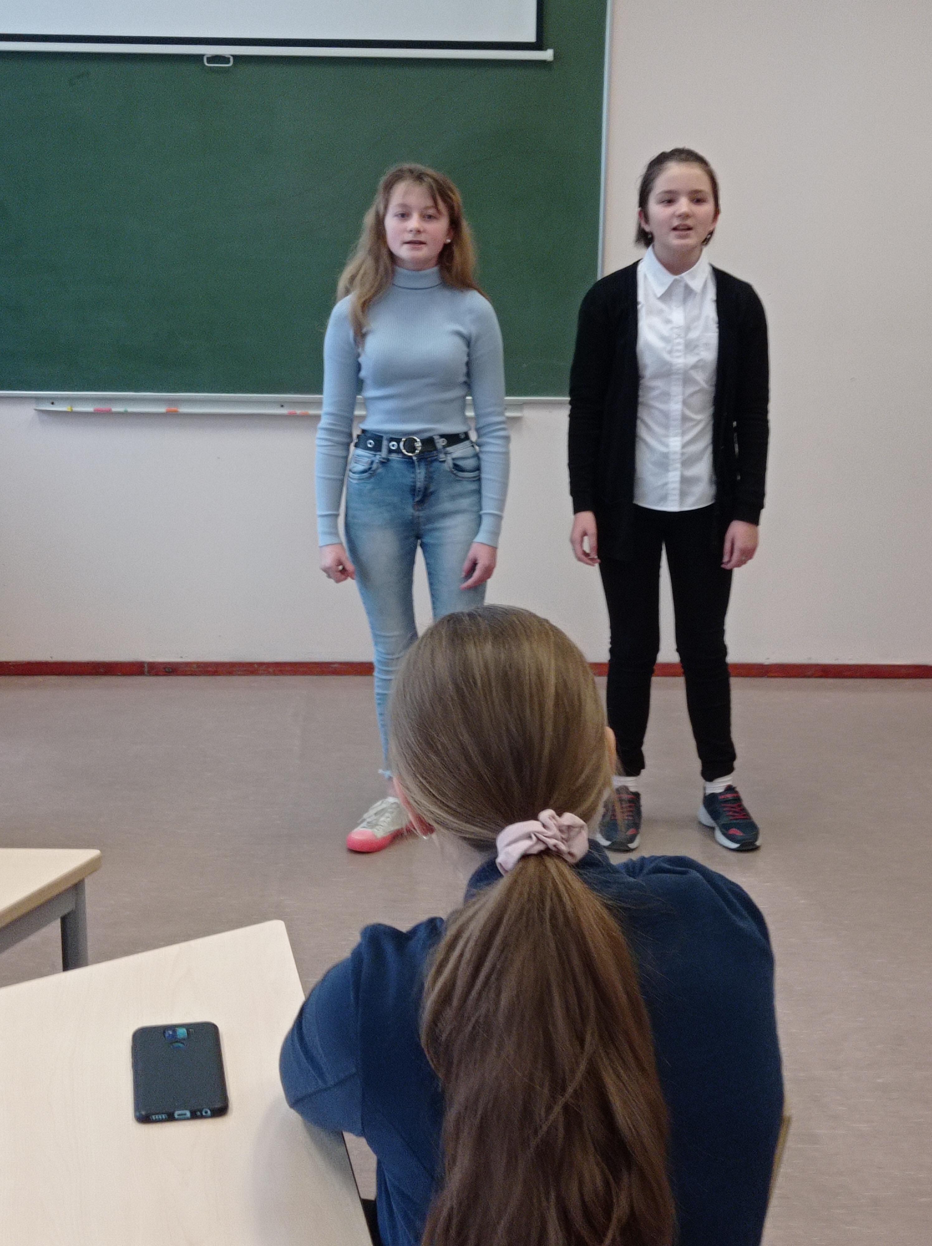 Чтобы игра была более яркой, в зале звучали песни. Открыли игру дует девочек 6А класса с песней «Ода музыке». В конце, когда жюри подсчитывало результат, также был музыкальный номер, в исполнении Александры Колпаковой (6А класс) – с песней «Волшебный мир искусства».
