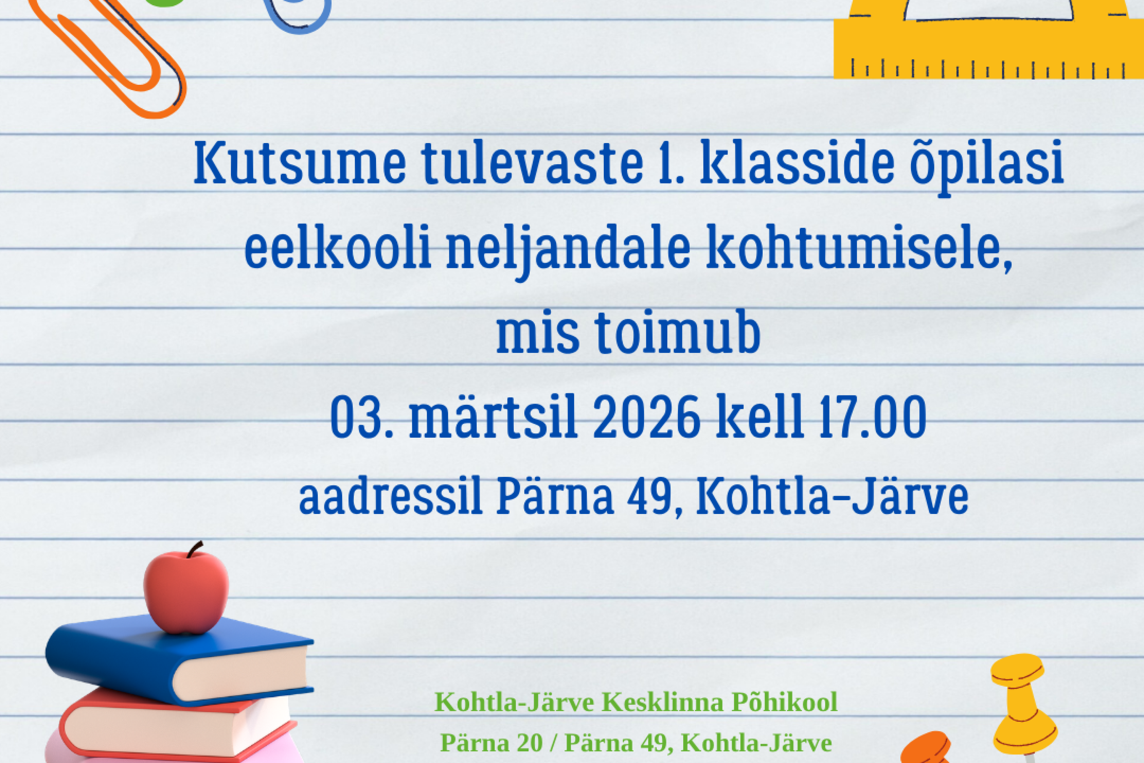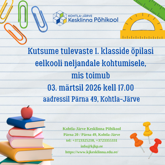 Kutsume tulevaste 1. klasside õpilasi eelkooli neljandale kohtumisele, mis toimub 3. märtsil 2026 kell 17.00 aadressil Pärna 49, Kohtla-Järve.