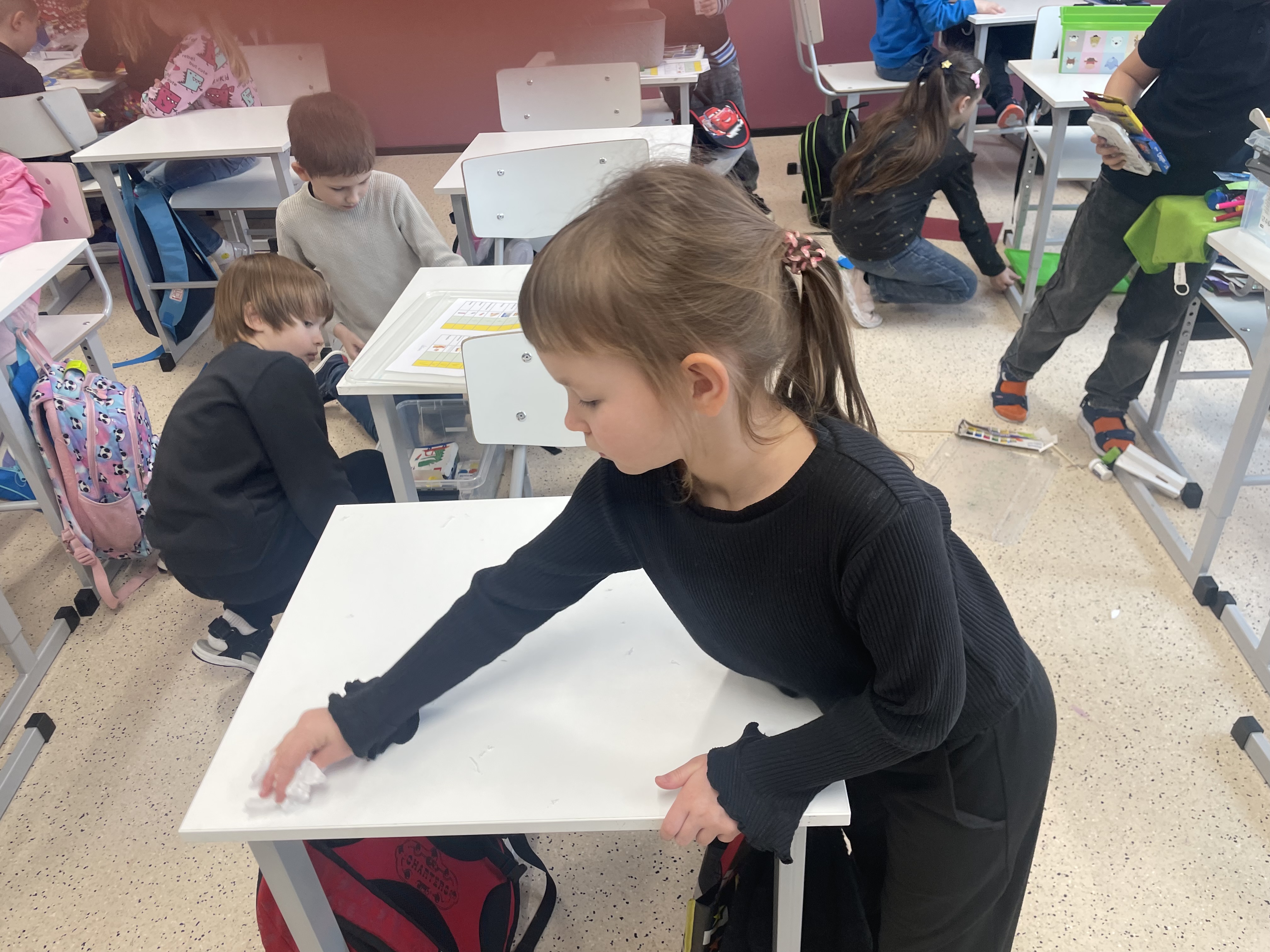 Lapsed asusid ülesande kallale suure entusiasmiga. Nad puhusid puhtaks tööõpetuse ja kunstitunni karbid ning pesid kapid, kus nende tarvikud on. Iga õpilane pani korda oma isikliku karbi, asetades kõik hoolikalt paika.