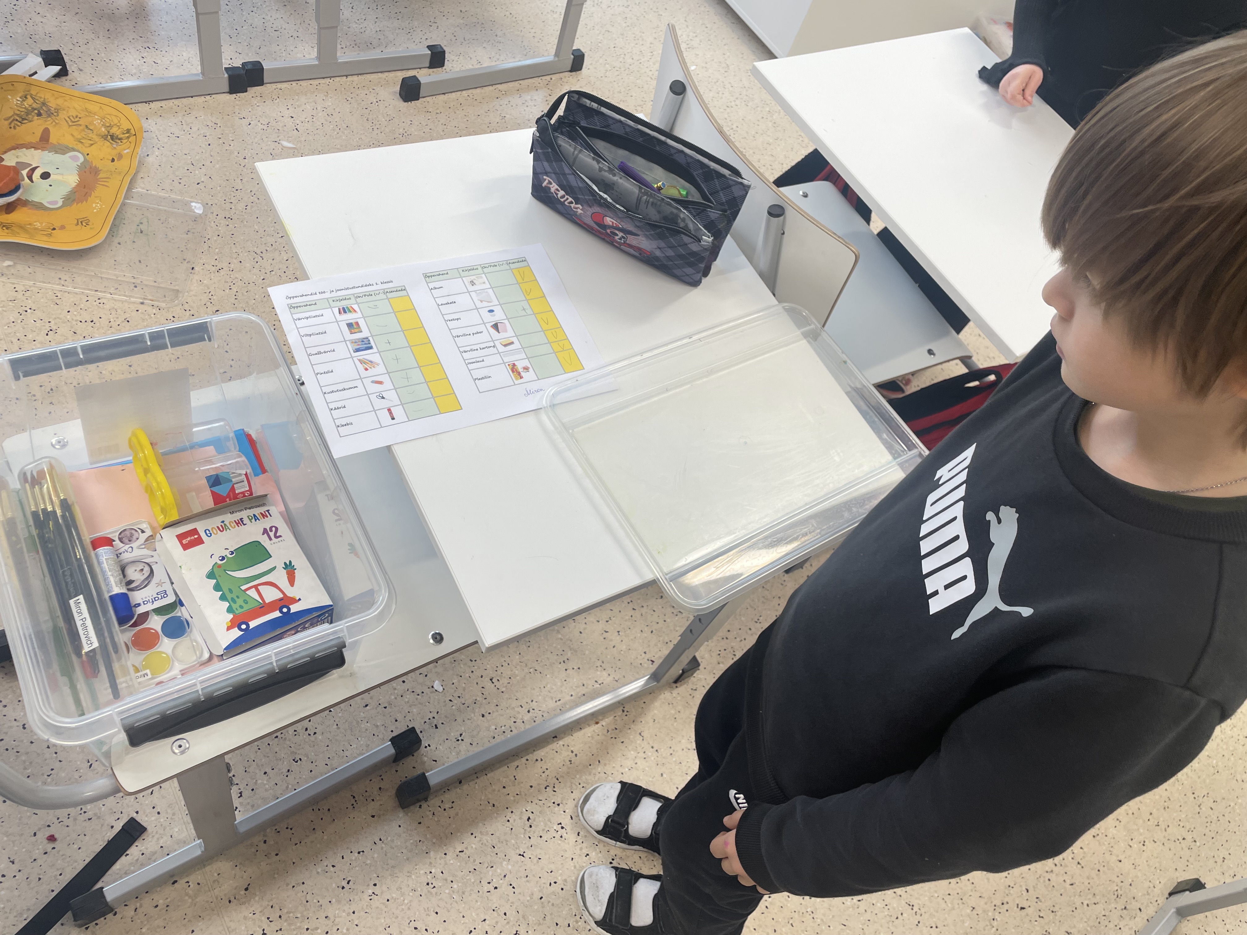 Õpetaja koostas eelnevalt koolitarvete nimekirja ja andis selle lastele, et neil oleks lihtsam. Lapsed lisasid sinna märkusi — mis on olemas, mida on vaja vahetada ja mis on otsa saanud. See aitas neil aru saada, mis asju veel puudub, et koolis oleks mugavam õppida.